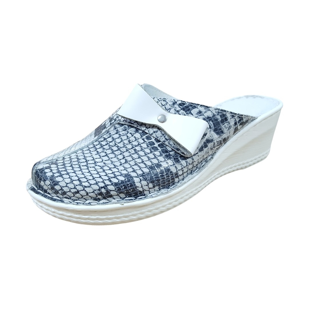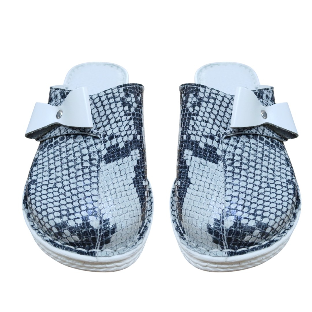 Adaugă o notă de eleganță garderobei tale de casă sau de serviciu cu acești papuci de damă din piele naturală, lucrați cu o atenție deosebită la detalii. Designul modern cu imprimeu tip piele de șarpe în nuanțe de gri se îmbină perfect cu talpa albă ergonomică, oferind un look sofisticat și un confort de neegalat.