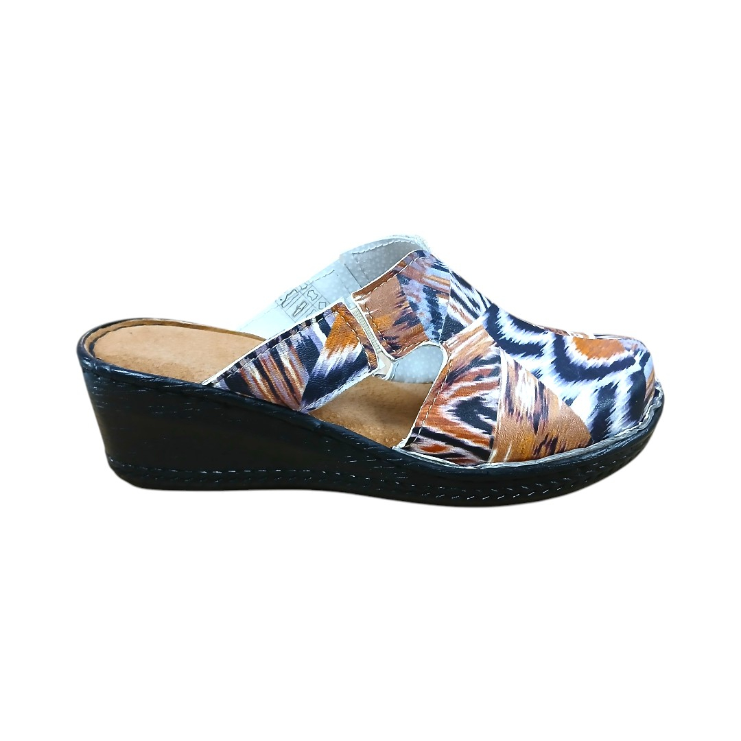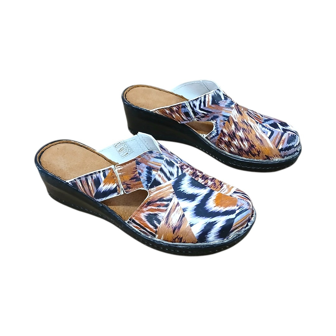 Stil modern: Spre deosebire de papucii medicali clasici, aceștia se remarcă printr-un model vibrant, cu imprimeu abstract în nuanțe de maro, portocaliu și albastru, ce adaugă o notă de originalitate și eleganță. Datorită designului deschis, se încalță și se descalță rapid, fiind extrem de practici.