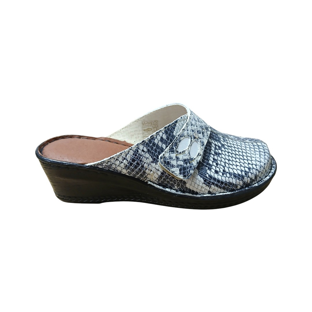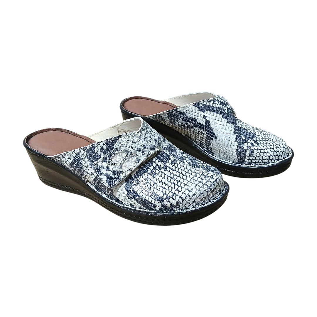 Sunt realizați din piele naturală de calitate, care asigură aerisirea optimă a piciorului. Designul este modern, evidențiat de imprimeul atractiv de șarpe în nuanțe neutre.